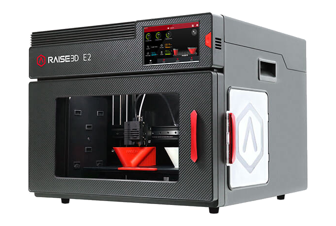 Imprimante 3D professionnelle à double extrusion indépendante, la Raise3D E2 est polyvalente et fiable, idéale pour des impressions variées.