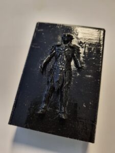 Pour le premier, j’ai choisi comme motif un personnage du jeux Ender scroll online. J’ai importé un STL du personnage que j’avais télécharge à partir du site thingiverse.com. Après modifier les proportions de la figurine pour correspondre à la boite, je l’ai modifier par opération booléenne pour supprimer l’arrière et je l’ai apposé au milieu d’une face.