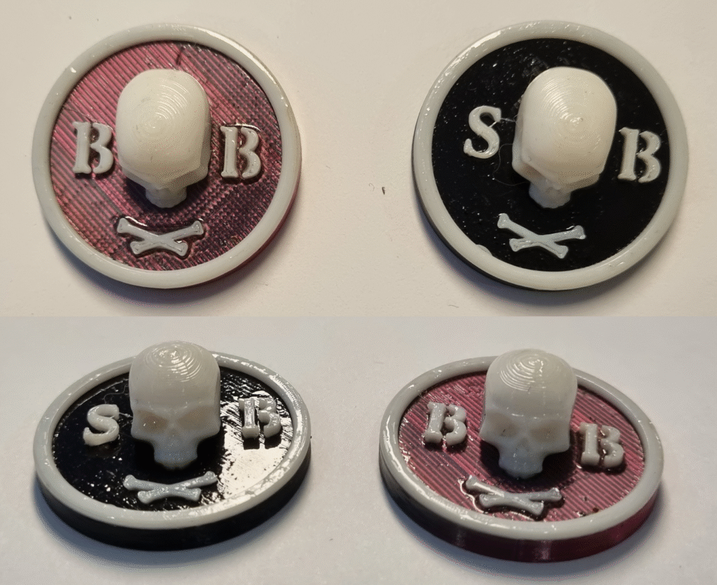 pour les deux jetons, j’ai récupéré une tête de mort sur thingivers (comme pour la figurine) que j’ai redimensionné pour l’incorporé à la pièce. J’ai dessiné deux tibias entrecroisé (oui, j’ai réussi à me persuader que c’était deux tibias 🙂 …) et mis en relief positif SB et BB de part et d’autre du crane.