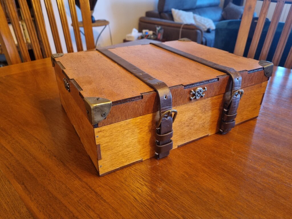 Et pour parfaire le tout, j’ai fabriqué une boîte de rangement en bois que j’ai ciré, conçue elle aussi sur FreeCAD et découpée au laser. Quelques articles récupérés ou chiné par-ci ou par-là pour orner et fermer la boite… Le rendu « vintage » est assez sympathique.