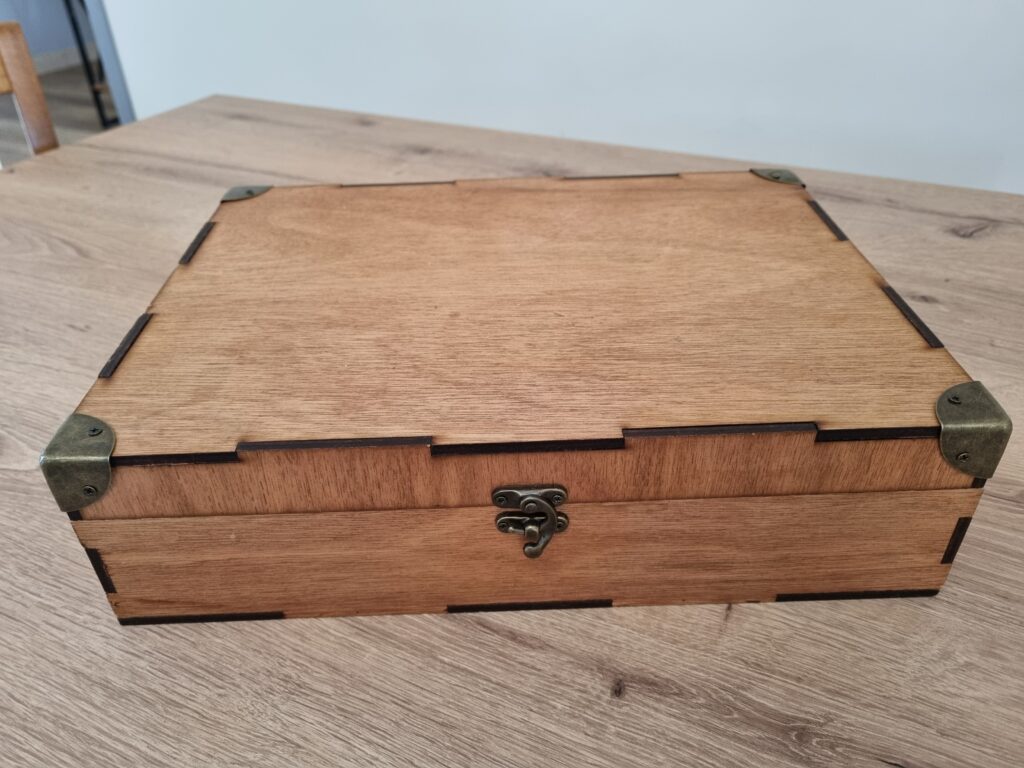 Dans un style simple et épuré, fait en peuplier 5 mm pour la structure externe, et 3,8 pour la structure interne. Laissé brut à l’intérieur, l’extérieur est ciré avec une teinte chêne clair. Quelques accessoires, coin de renfort d’angle et attache vintage miniature (pour rester dans les proportion de la boite), et le tour est joué.