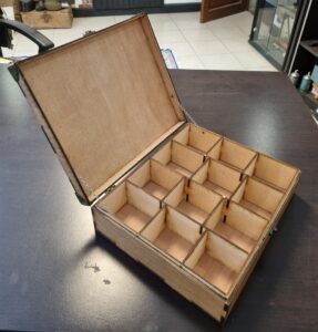 A vrai dire, mon premier essais n’a pas été concluant. Si vous l’avez remarquez, la boite en tête d’article n’est pas la même. Un peu grande, 17 compartiments contre 12 pour le modèle retenu. Et de plus, une petite erreur dans les côtes de la structure interne qui donne un style « boite de travers ».  😁
