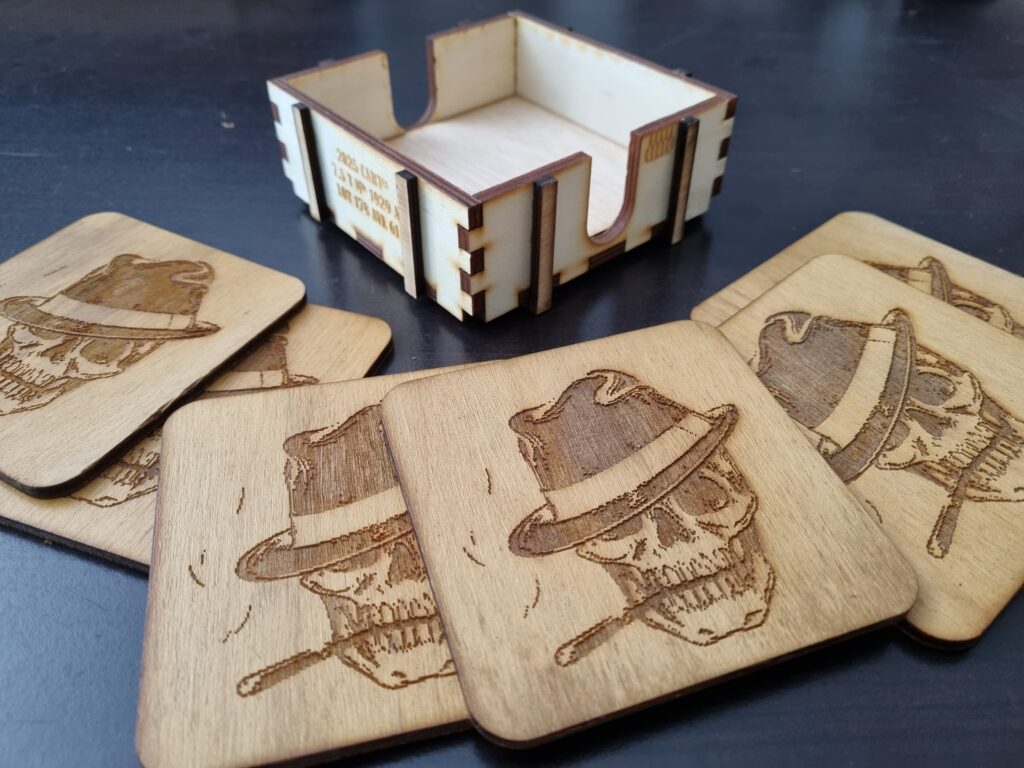 ensemble de sous-verre réalisé à la découpe/gravure laser avec sa boite de rangement.