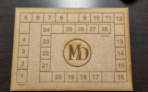 Conception et fabrication d’un jeu type “jeu de l’oie” imaginé par une hôtesse de la marque M Distribution. Réalisé grâce à la découpe et gravure laser, ce plateau allie créativité, précision et utilité pour animer les ventes de manière ludique et originale.