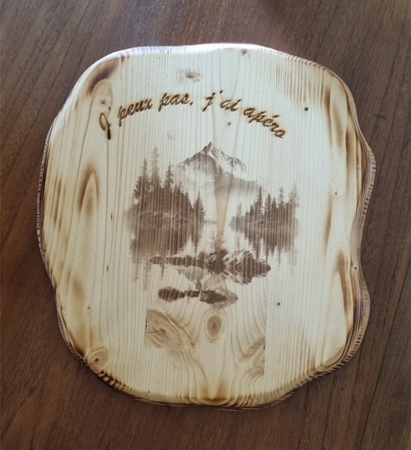 Allier finesse et caractère : une planche apéro upcyclée mixant gravures laser diode et CO2, sublimée par une finition brûlée au chalumeau.